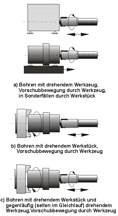 Die Arbeitsweisen beschreiben die Konstellationen der Schnitt- und Vorschubbewegungen, die zur Erzeugung einer Tiefbohrung möglich sind und dementsprechend auch von den Maschinen bereitgestellt werden müssen. Je nach Maschinentyp können alle oder zumindest eine der im folgenden dargestellten Arbeitsweisen realisiert werden.