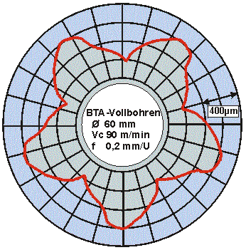 Tragspuren an BTA-Vollbohrwerkzeugen, die eine Drallbohrung erzeugt haben, weisen vielfach daraufhin, dass die Verlagerung