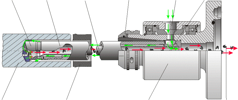 Ringraum zwischen dem Bohrrohr und einem Innenrohr (Zweirohrverfahren). Der Kühlschmierstoff tritt am Bohrkopf seitlich aus, umspült diesen und fließt mit den Spänen im Innenrohr zurück. Ein Teil des Kühlschmierstoffs wird über eine Ringdüse in das Innenrohr eingeleitet. Durch den entstehenden Unterdruck am Spanmaul wird der Rückfluss ermöglicht (Ejektor-Effekt). Die nachfolgenden Bilder zeigen die wesentlichen Merkmale dieses Verfahrens. Im Gegensatz zum BTA-Verfahren entfällt die Abdichtung gegen Austreten von KSS.