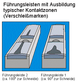 Besonders zu beachten ist die Wechselwirkung zwischen Führungsleisten- und Schneidenverschleiß. Eine neu eingesetzte Schneide verschleißt (an der Rundschlifffase) viel schneller, wenn die verschlissenen Führungs- leisten nicht gleichzeitig ausgewechselt wurden.