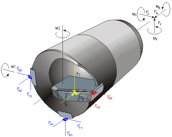 Das Bild zeigt die wesentlichen Kräfte und Momente, die am Werkzeug wirken. Die Massenkräfte sowie die vom KSS verursachten Kräfte sind hier vernachlässigt worden.