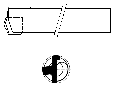 Schematische Darstellung eines “T-Platten-Werkzeuges”, hier mit direkt in das Bohrrohr eingearbeitem HM-Einsatz. (Eingesetzt bei kleinsten Werkzeugen ab Durchmesser ca. 6 mm)