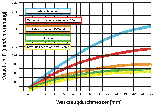 Der Vorschub gehört zu den Schnittgrößen. In Abhängigkeit vom Tiefbohrverfahren, vom Werkstückstoff, von der Werkzeugmaschine und ggf. von weiteren Randbedingungen sind vom Anwender für einen geplanten Tiefbohrvorgang geeignete